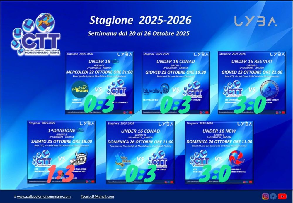 La settimana CTT si apre martedì 22 ottobre a Buggiano, dove la U18 Distretti Ecologici inaugura il turno di gare con una vittoria imponendosi per 3-0 sull’Edro 21 Buggiano (21-25, 19-25, 13-25).